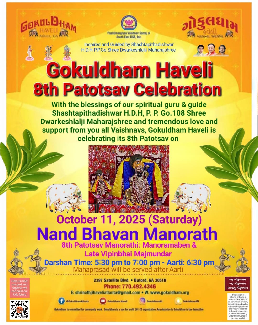 અમે અત્યંત આનંદ અને દિવ્ય કૃતજ્ઞતા સાથે, ગોકુલધામ હવેલી એટલાન્ટા વતી તમામ વૈષ્ણવો અને ભક્તોને અમારા ૮મા પાટોત્સવની ઉજવણીમાં જોડાવા માટે હાર્દિક આમંત્રણ આપીએ છીએ.